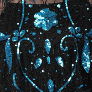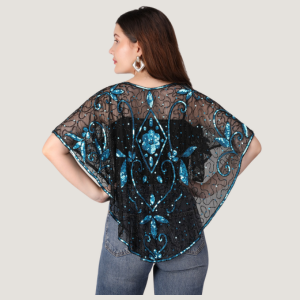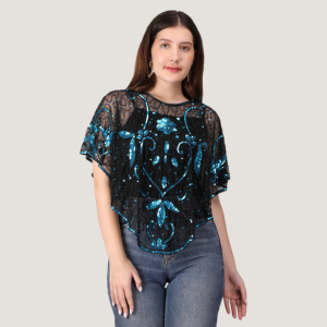 Make a bold style statement with the Azure Glam Sequin Cape Top, designed to add a pop of shimmer to your wardrobe. Crafted on a sheer black net fabric, this cape-style top features striking blue sequin embroidery in artistic floral and swirl patterns, giving it a unique and luxurious look.