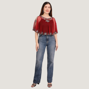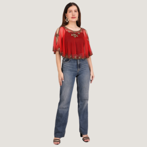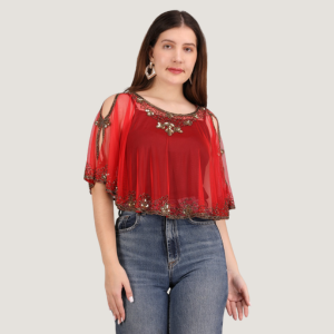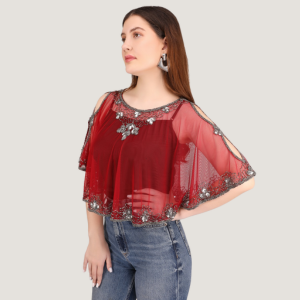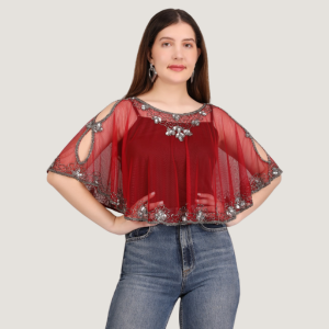 Make an unforgettable style statement with the Crimson Royale Embellished Cape Top, a blend of sophistication and festive charm. Crafted from a rich crimson sheer fabric, this cape-style top flows beautifully and adds graceful movement with every step.