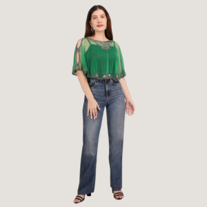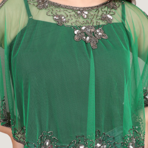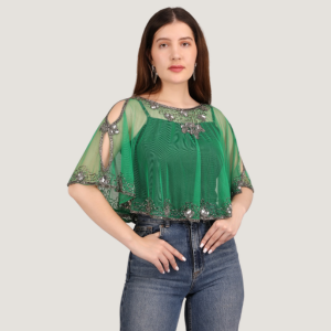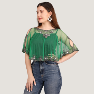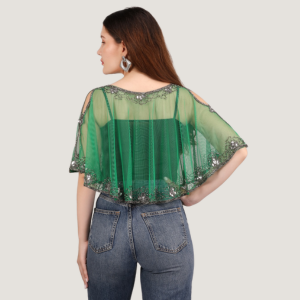 Elevate your glam game with the Emerald Royale Embellished Cape Top, a beautiful blend of elegance and modern style. Crafted from a rich emerald green sheer fabric, this top features intricate silver sequin and bead embellishments along the neckline and hem, adding a luxurious touch.