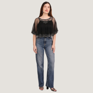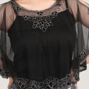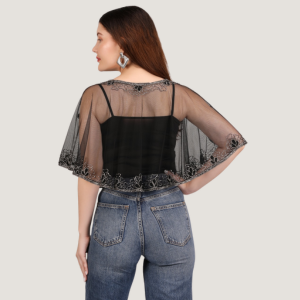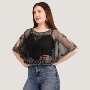Step into sophisticated glamour with the Midnight Elegance Embellished Cape Top, designed to make every moment shine. Crafted from a soft black sheer fabric, this cape-style top drapes beautifully over the shoulders, offering a flowy and graceful silhouette.