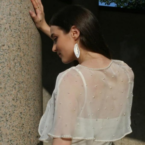 Add an elegant charm to your outfit with this stunning pearl embellished net cape shrug by Zarinivas. Crafted from premium sheer net fabric, this cape features delicate pearl work and a clean, soft finish that complements both ethnic and Western wear. The lightweight design drapes beautifully over gowns, sarees, and lehengas, offering a modern alternative to traditional dupattas. Perfect for weddings, receptions, parties, or festive occasions, this shrug adds graceful coverage to sleeveless dresses while maintaining a fashionable look. The intricate pearl detailing around the neckline and edges adds just the right touch of sophistication to elevate your ensemble. Whether you’re a bride, bridesmaid, or simply dressing up for a special evening, this cape shrug is your go-to layering piece for instant glamour.